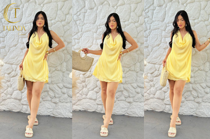 Entre no clima da estação com o nosso conjunto de seda na cor amarela, a escolha perfeita para um verão vibrante e cheio de estilo. A fluidez do tecido e a modelagem solta garantem leveza e conforto. Combine com acessórios de palha para um visual ainda mais autêntico e tropical chic.