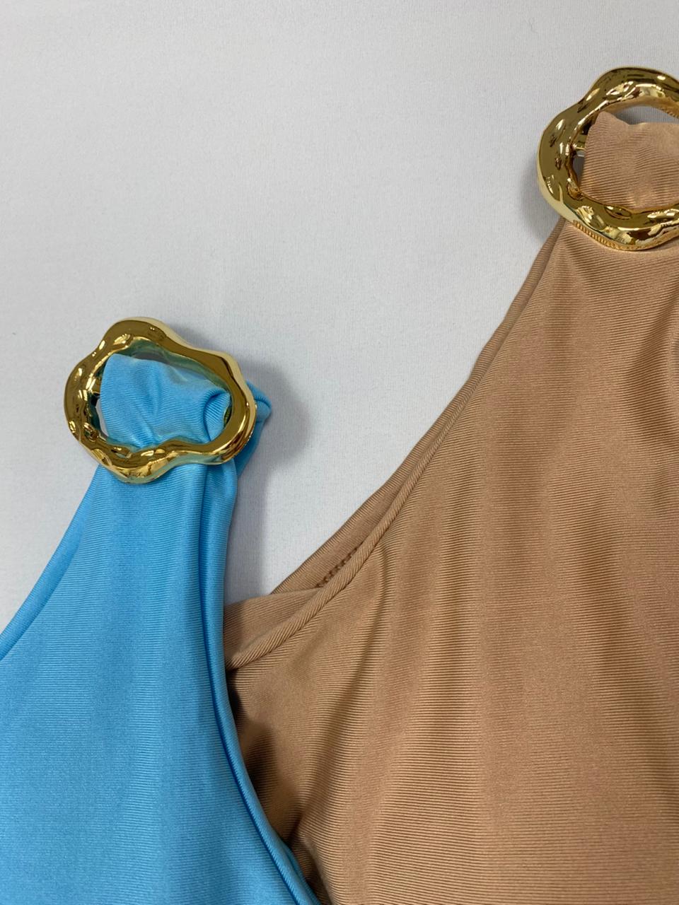 O design de um ombro só, com o detalhe dourado na alça, eleva o visual e adiciona um toque de sofisticação. O tecido, super macio e com um brilho sutil, proporciona um caimento impecável. Disponível em duas cores lindas, azul e nude, você pode criar looks incríveis para qualquer ocasião. O azul é vibrante e a cara do verão, enquanto o nude é chique e super fácil de combinar.