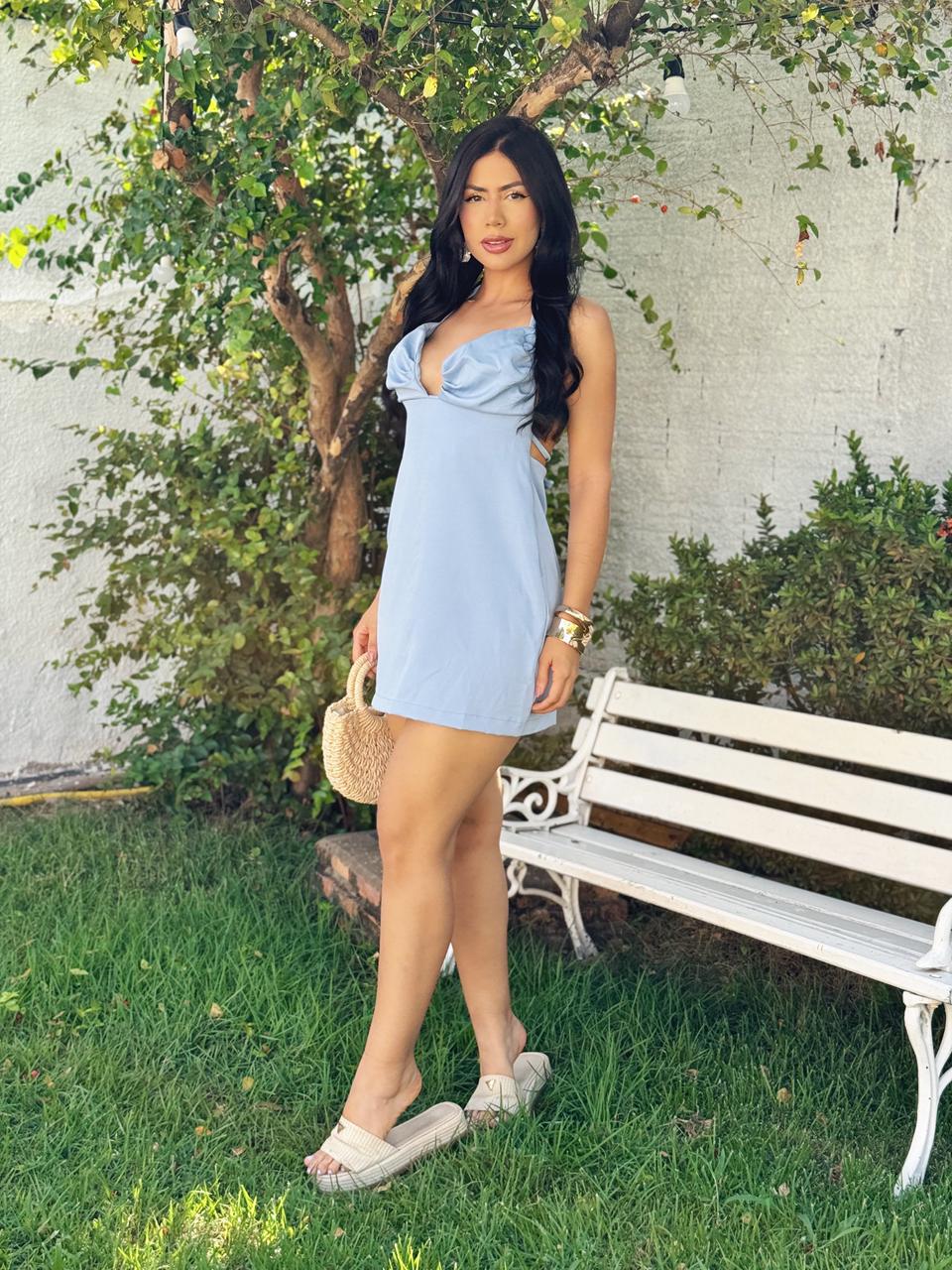 Um vestido versátil e charmoso para destacar sua feminilidade. O modelo curto em azul claro possui decote moderno e caimento leve, perfeito para passeios, encontros e ocasiões especiais.